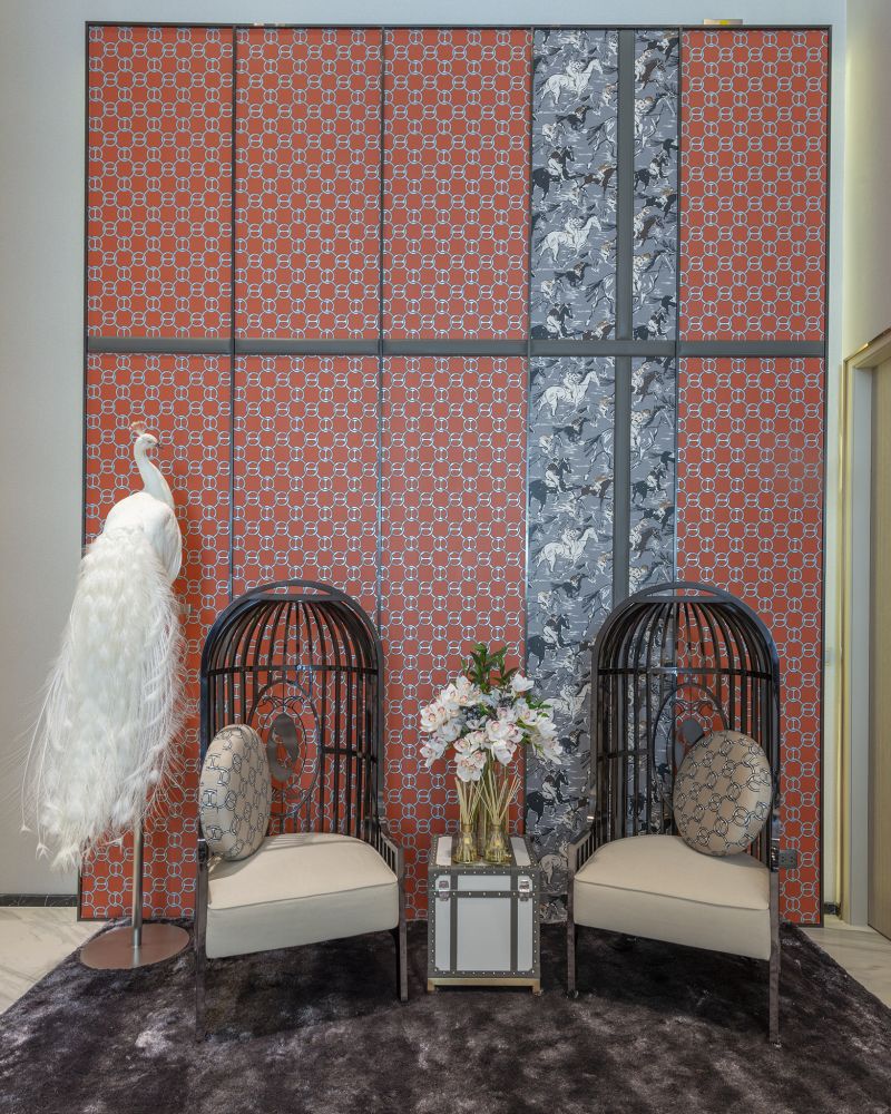 นอกจากนี้ เฟอร์นิเจอร์ยังสั่งทำพิเศษ เพื่อเป็น Signature ของโครงการ ด้วยลวดลายนกยูง ที่มีเอกลักษณ์เฉพาะตัว ซึ่งจากในภาพมุมนี้จะเป็น โซน Display ตัวอย่างผ้าบุเฟอร์นิเจอร์และวอลเปเปอร์จากแอร์เมส ที่ทางโครงการฯ ใช้ตกแต่งใน The Sky Chamber ซึ่งเป็น Business Lounge ที่อยู่สูงที่สุดของโครงการนี้