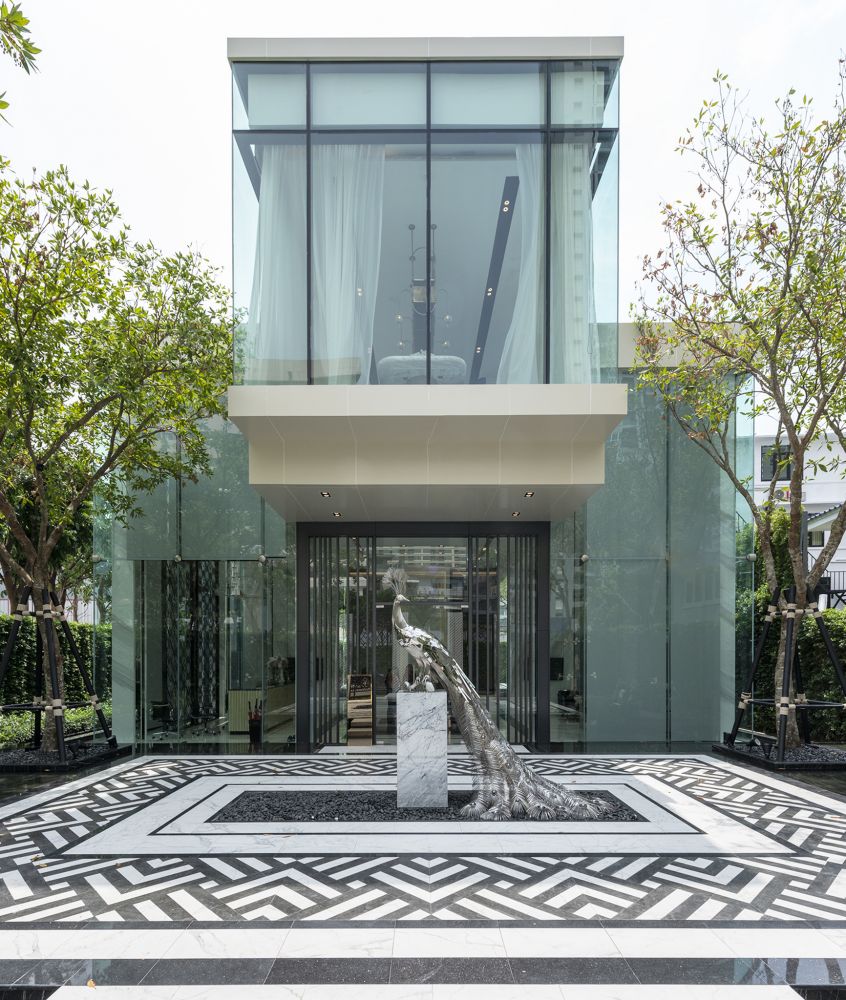 สำหรับการออกแบบภายนอกอาคาร มีการใช้หิน White Limestone หินเกรดดีจากประเทศโปรตุเกส นำมากรุส่วน Façade ด้านหน้าของตึก ที่ควบคู่ไปกับ ลายฉลุจากนกยูง ซึ่งเป็นสัญลักษณ์ของโครงการ ที่ให้ความรู้สึกหรูหรา โอ่อ่า และสวยงาม