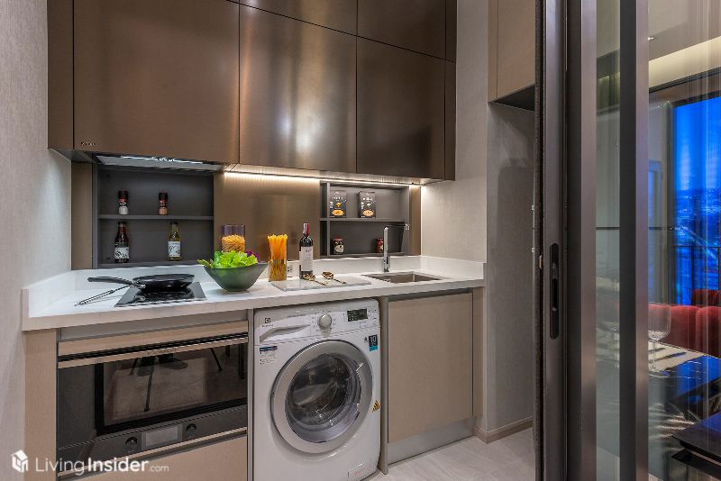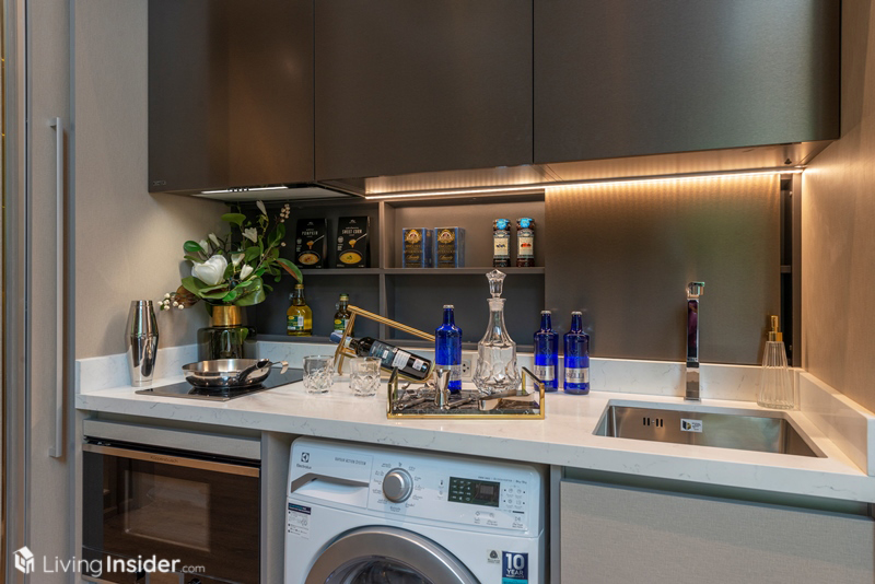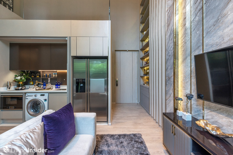 เปิดประตูเข้ามาจะพบกับห้องนั่งเล่นเป็นอันดับแรก มีความหรูหราแบบเรียบง่าย พื้นถึงฝ้าสูง 3 เมตร พื้นเป็นไม้ Hybrid Engineering Wood ซึ่งทนการขังน้ำและรอยขีดข่วนได้ดีกว่าพื้นรุ่นเก่า แต่ก่อนจะไปถึงตรงนั้น เราแวะดูห้องครัวที่อยู่ทางซ้ายมือก่อนดีกว่า จะได้ครัวปิด ชุดครัว ตู้เก็บของด้านบน รวมถึงผนังหลังเตา เป็นของ Kohler