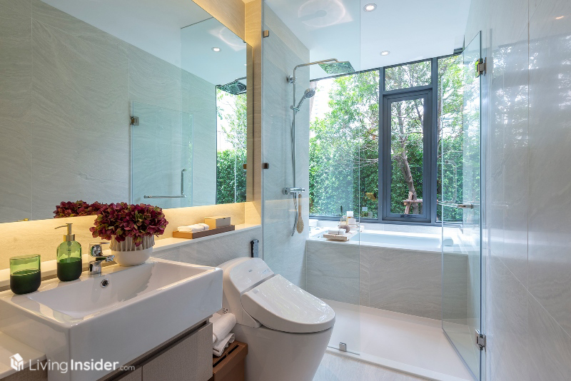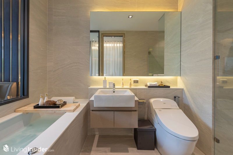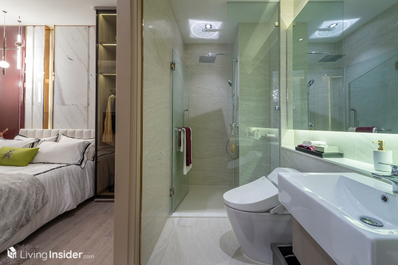 ซึ่งระหว่างมุมกินข้าวกับโซนนั่งเล่นจะมีทางเดินขั้นกลาง เพื่อเดินไปยังส่วนของห้องนอน โดยจะพบกับ ห้องน้ำก่อนทางซ้ายมือ ลักษณะเป็นแนวลึก อุปกรณ์ครบครันพร้อมใช้งาน และมีทางเข้า-ออก เชื่อมไปยังห้องนอนเล็กได้
