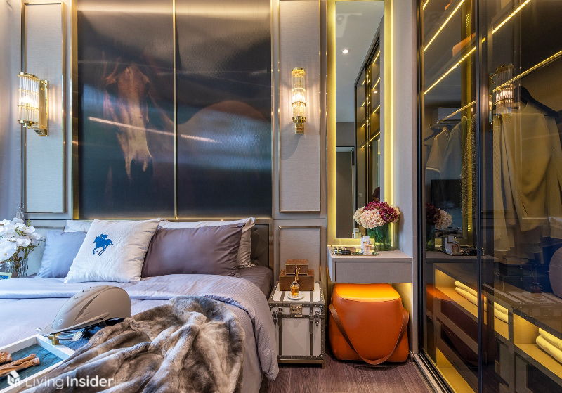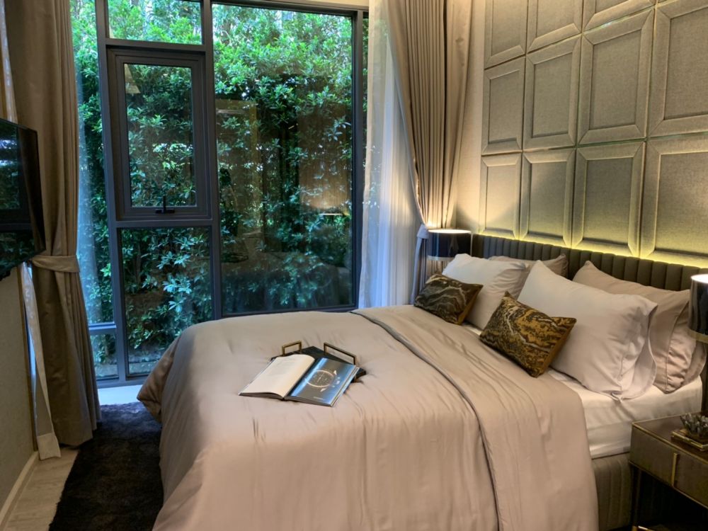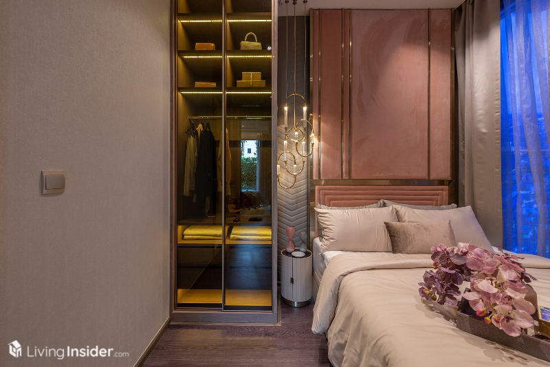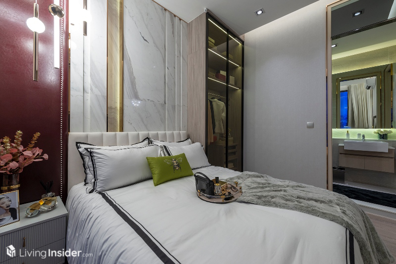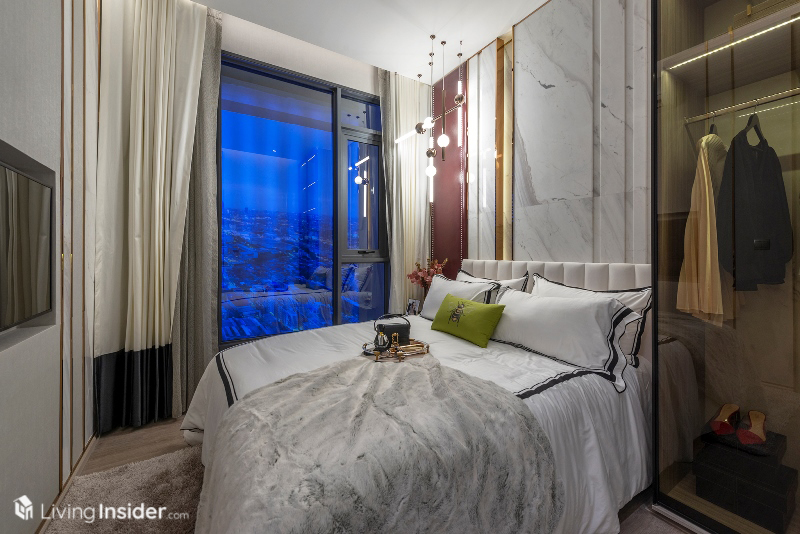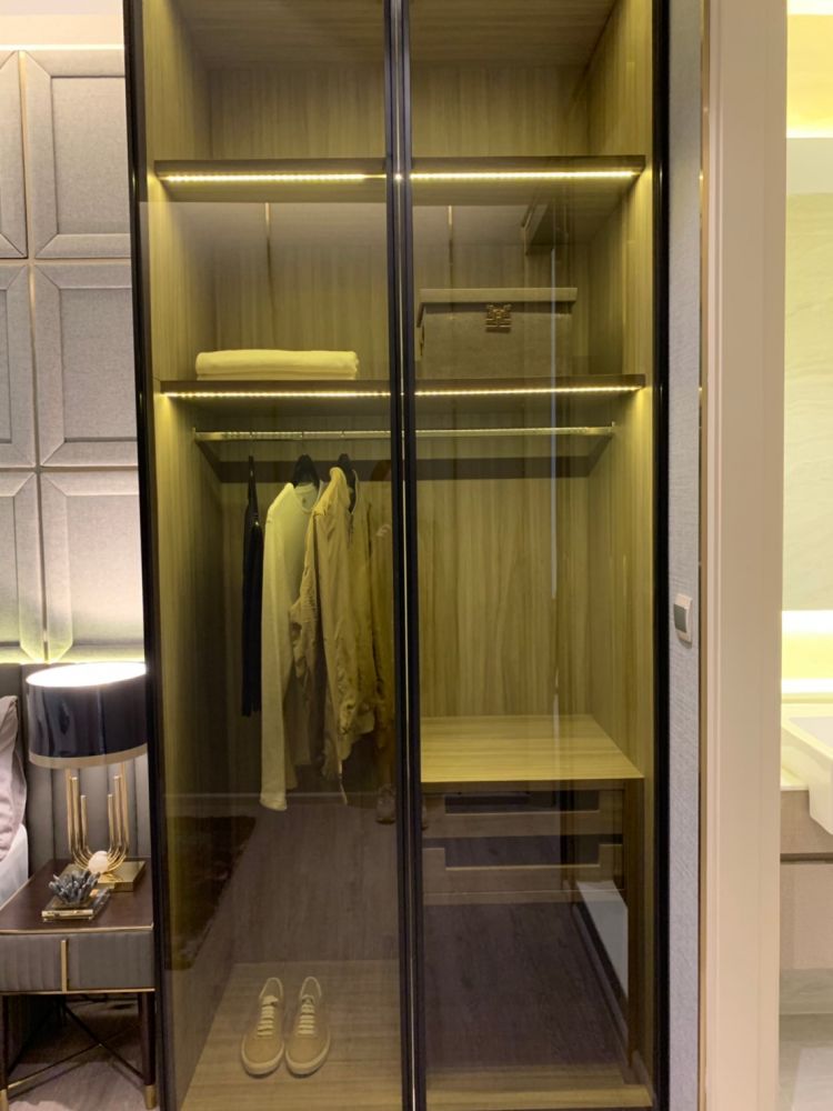 เตียงนอนวางควีนไซส์ได้ ตู้เสื้อผ้าจะได้ในส่วนของผนังตู้เสื้อผ้า ฝั่งติดห้องนั่งเล่นเป็นกระจกใสอีกด้วย เพิ่มความโปร่งโล่งให้กับห้องชุด ทำให้ห้องนี้มองแล้วดูกว้างขวางไม่รู้สึกอึดอัดอย่างที่คิดเอาไว้