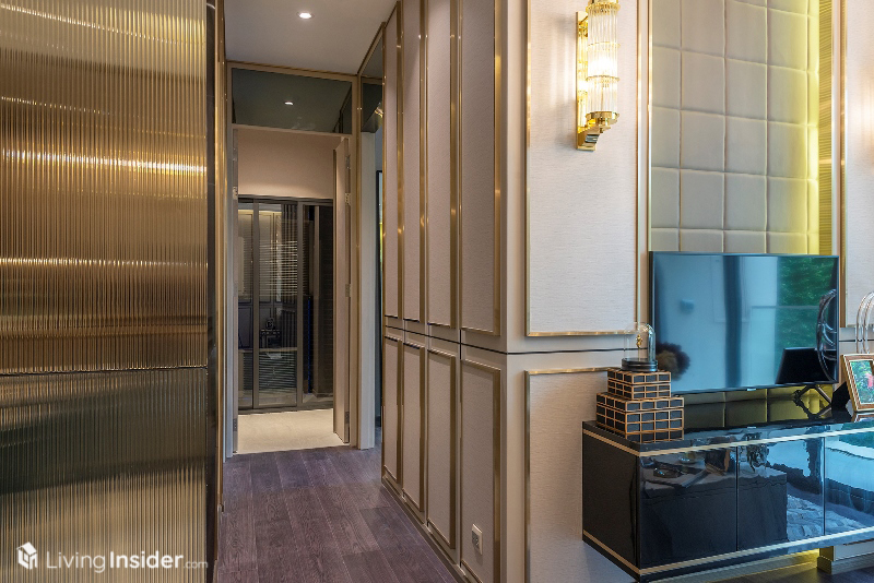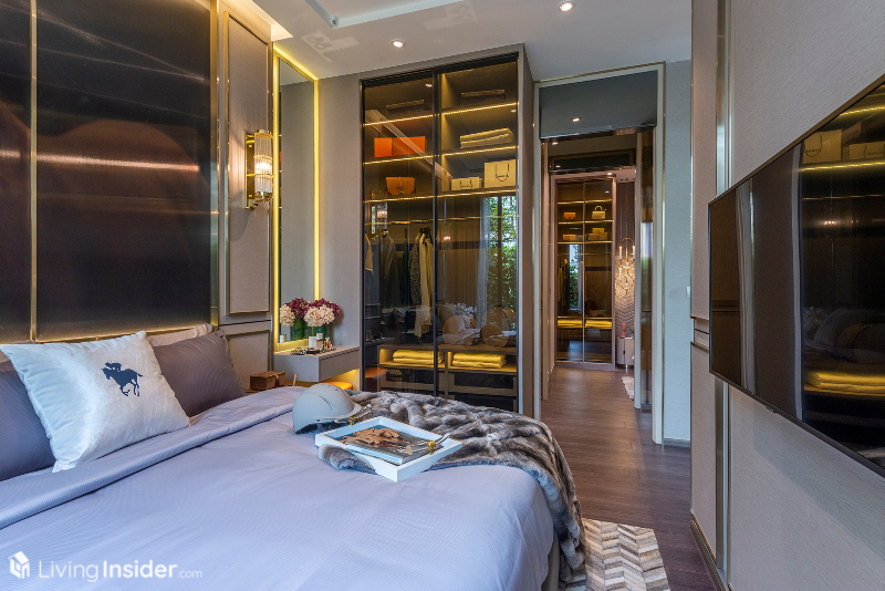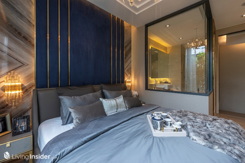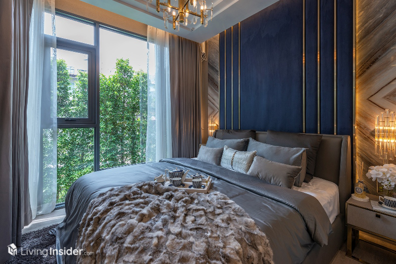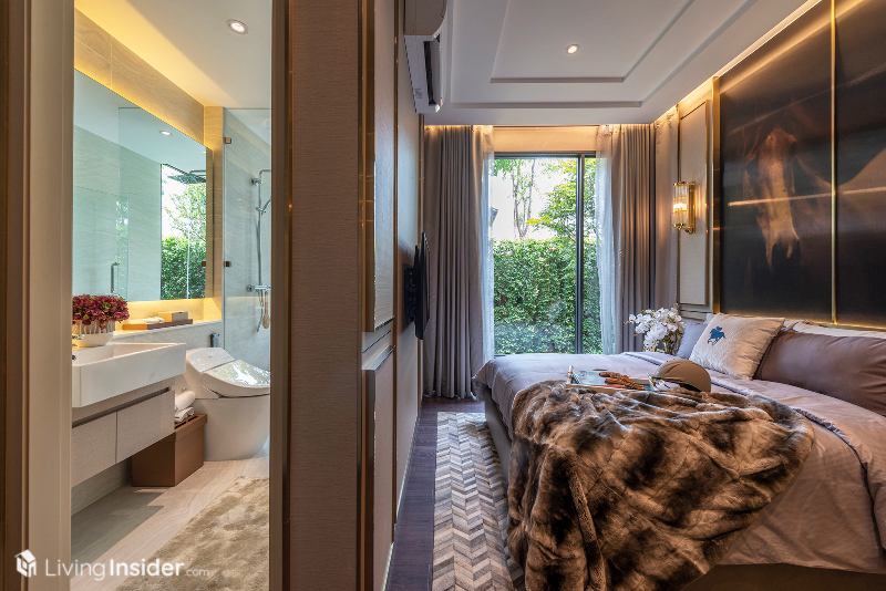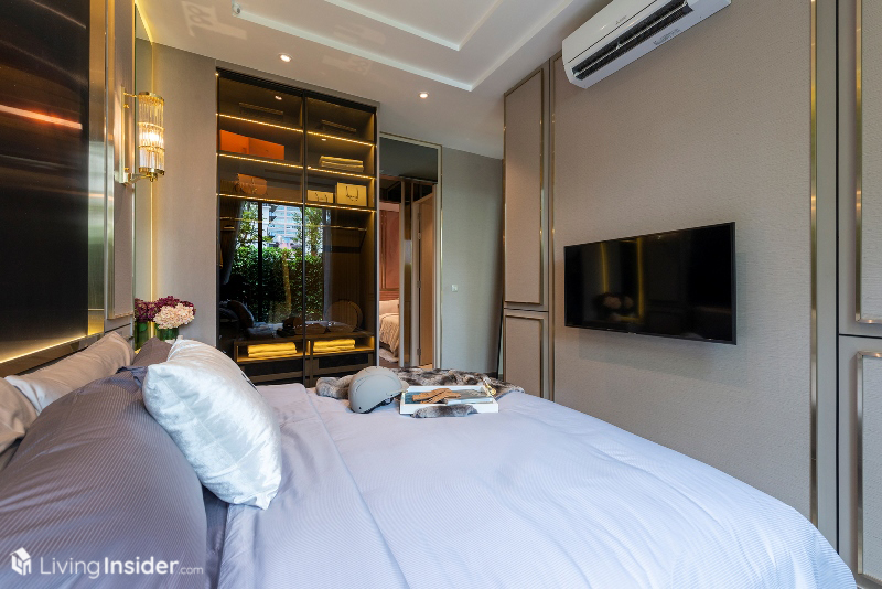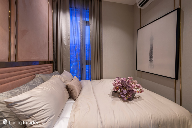 เตียงนอนวางควีนไซส์ได้ ตู้เสื้อผ้าจะได้ในส่วนของผนังตู้เสื้อผ้า ฝั่งติดห้องนั่งเล่นเป็นกระจกใสอีกด้วย เพิ่มความโปร่งโล่งให้กับห้องชุด ทำให้ห้องนี้มองแล้วดูกว้างขวางไม่รู้สึกอึดอัดอย่างที่คิดเอาไว้