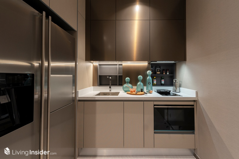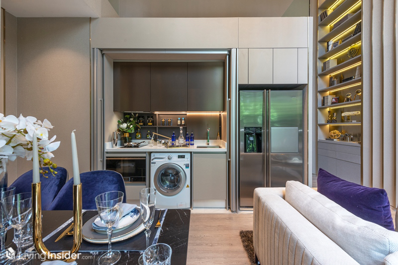 ข้างหลังเป็นพื้นที่ของครัว ซึ่งถ้ามองเผินๆ ก็เหมือนกับสองห้องก่อนหน้านี้ แต่ความจริงคือ มีฟังก์ชั่นเป็นประตูปิดส่วนครัวมาให้ด้วย! พอปิดแล้วดูกลมกลืนไปกับผนัง ทำให้ดูเป็นระเบียบเรียบร้อยมากกว่าเดิมอีกเท่าตัว