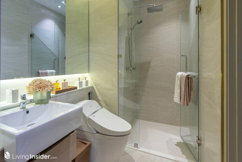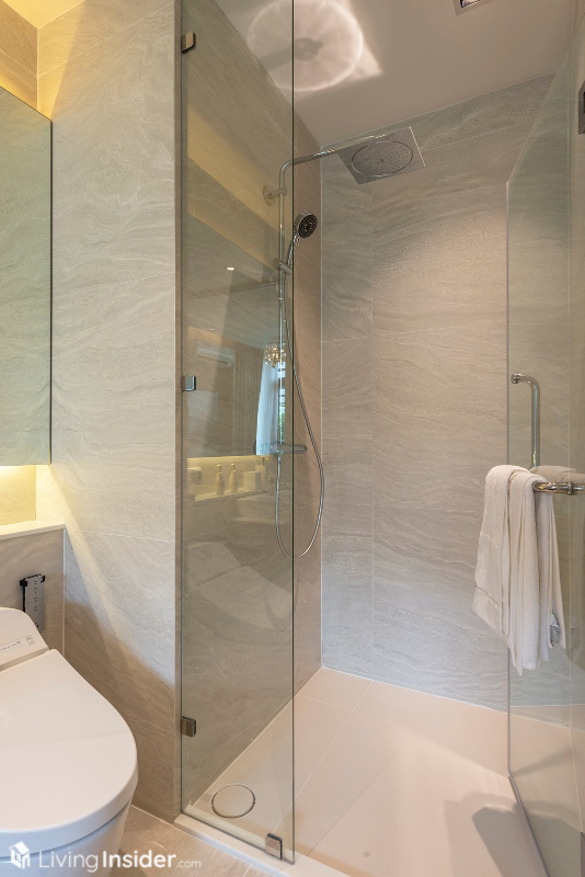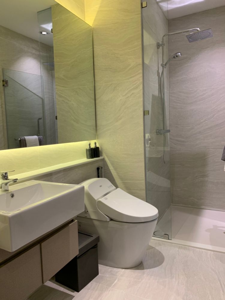ขวามือของห้องเป็น ห้องน้ำ แนวลึก มีข้อดีตรงที่ทำทางเข้า-ออกตรงห้องนอนเพิ่มมาด้วย ทำให้สะดวกมากยิ่งขึ้น สุขภัณฑ์ของ Grohe+ToTo ติดกระจกพร้อมที่วางของด้านหลังยาวเต็มผนัง โถสุขภัณฑ์อัตโนมัติ Rain Shower และติดฉากกั้นอาบน้ำมาให้เรียบร้อย