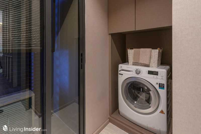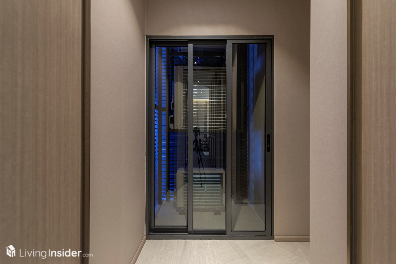 ต่อด้วยสุดทางเดิน จะเป็นในส่วนของตำแหน่งวางคอมเพรสเซอร์ ที่มีประตูบานเลื่อนแบบกระจกใสกั้นไว้ และมุมขวามือสำหรับวางเครื่องซักผ้า