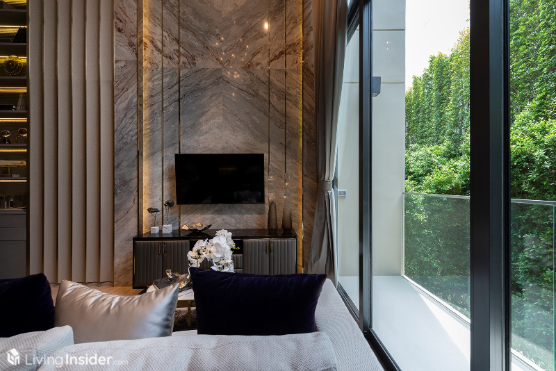 ซึ่งเดินเข้ามาอีกนิด จะเห็นความสูงโปร่งของห้องนี้ได้อย่างชัดเจน เพราะจากพื้นถึงเพดานสูงถึง 5.8 เมตร พื้นที่ห้องนั่งเล่น จะวางโซฟา 2 หรือ 3 ที่นั่งก็ไม่ใช่ปัญหา ติดกันเป็นระเบียงมีขนาดยาว โดยได้ประตูบานเลื่อนแบบกระจกใส พร้อมหน้าต่างที่สูงจรดเพดาน ทำให้แสงเข้ามาได้อย่างเต็มที่ ห้องจึงยิ่งดูโปร่งเข้าไปใหญ่