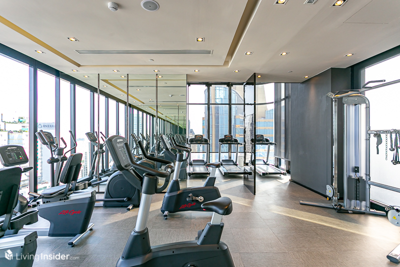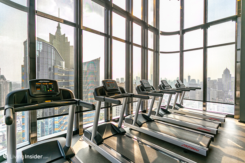 ส่วนอีกด้านเป็น Fitness กระจกโค้งใสทั้งแถบให้สามารถมองวิวเมืองได้เต็มสายตา ข้างๆ กันเป็น Steam Room และ Sauna Room