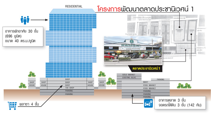 สำหรับรูปแบบที่ 1 ประกอบด้วย อาคารตลาด 2 ชั้น 266 หน่วย อาคารพาณิชย์ 4 ชั้น 129 หน่วย อาคารสำนักงาน 6 ชั้น อาคารจอดรถ 4 ชั้น 260 คัน และที่จอดรถแนวราบ 43 คัน , แบบที่ 2 ประกอบด้วย อาคารพาณิชย์ 4 ชั้น 129 หน่วย อาคารสำนักงาน 6 ชั้น อาคารจอดรถ 4 ชั้น 260 คัน อาคารที่พักอาศัย 15 ชั้น 225 หน่วย ที่จอดรถแนวราบ 77 คัน และแบบที่ 3 ประกอบด้วย อาคารพาณิชย์ 4 ชั้น 73 หน่วย อาคารสำนักงาน 6 ชั้น อาคารจอดรถ 4 ชั้น 260 คัน อาคารที่พักอาศัย 30 ชั้น 696 หน่วย ขนาด 40 ตารางเมตรต่อหน่วย พลาซ่า 4 ชั้น+ที่จอดรถใต้ดิน 693 คัน ที่จอดรถแนวราบ 72 คัน
