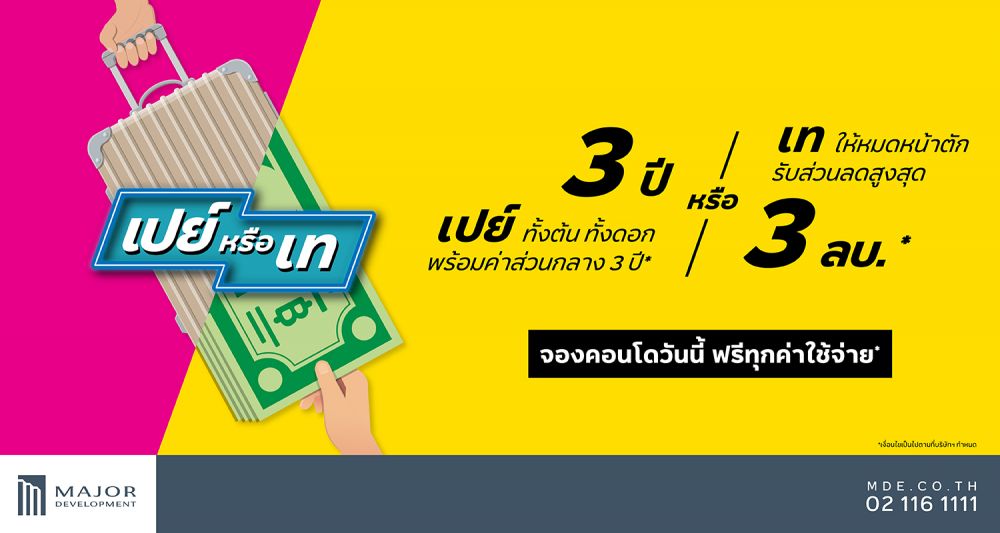 โอกาสเดียวที่คุณจะได้ครอบครอง คอนโดทำเลคุณภาพที่ดีที่สุด ห้ามพลาด “เมเจอร์ เปย์ หรือ เท” กับ 6 โครงการที่สามารถเลือกความคุ้มค่าได้เอง คนชอบเปย์ อยู่ฟรีนานสุด 3 ปี หรือ คนชอบเท รับส่วนลดสูงสุด 3 ล้านบาท