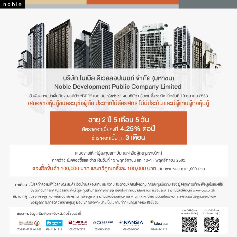 บริษัท โนเบิล ดีเวลลอปเมนท์ จำกัด (มหาชน) หรือ NOBLE ได้ยื่นแบบแสดงรายการข้อมูลเพื่อขออนุญาตออกและเสนอขายหุ้นกู้ประเภทไม่ด้อยสิทธิ ไม่มีประกัน และมีผู้แทนผู้ถือหุ้นกู้ ให้แก่ผู้ลงทุนสถาบัน และ/หรือ ผู้ลงทุนรายใหญ่ ต่อสำนักงานคณะกรรมการกำกับหลักทรัพย์และตลาดหลักทรัพย์ (ก.ล.ต.) จำนวน 1 รุ่น อายุ 2 ปี 5 เดือน 5 วัน