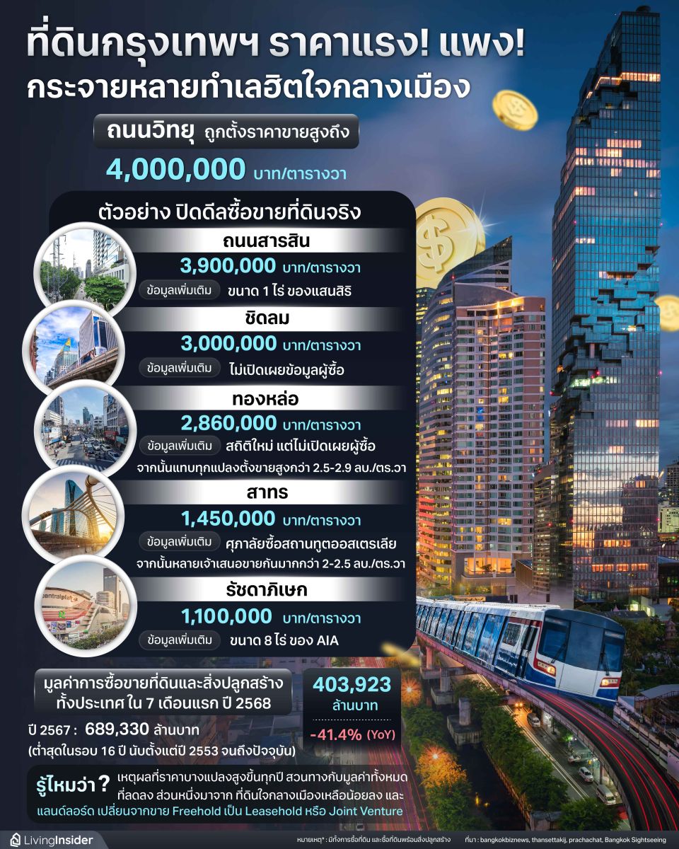 แม้ว่ามูลค่าการซื้อขายที่ดินและสิ่งปลูกสร้างทั้งประเทศ ใน 7 เดือนแรก ปี 2568 จะลดลงจากปีก่อนหน้า เหลือเพียง 403,923 ล้านบาท แต่ในกรุงเทพฯ ทำเลใจกลางเมือง ยังคงมีการซื้อขายที่ดินราคาสูงอย่างล่าสุด ถนนวิทยุ ก็มีการตั้งราคาขายไว้ถึง 4,000,000 บาท/ตารางวา