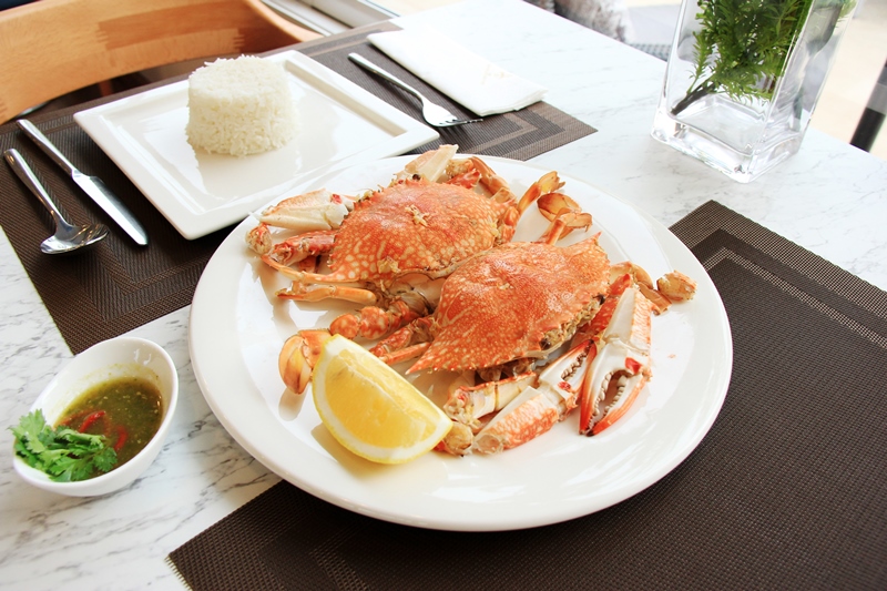 เมนูแรก ปูม้าสดๆนึ่ง เนื้อปูแน่นๆ ตัวโตๆ พร้อมน้ำจิ้มซีฟู๊ด สุดแซ่บ เห็นแล้วน้ำยายไหย