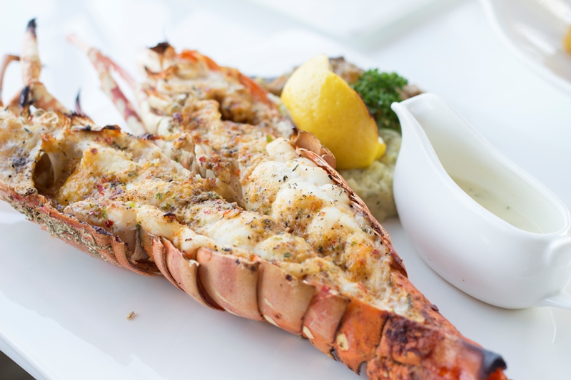 กุ้งมังกรเจ็ดสีย่าง กุ้งมังกรเจ็ดสีหมักด้วยไวน์ขาว ทาด้วยชิลลี่บัตเตอร์สูตรเฉพาะของทางร้าน แล้วนำมาย่างส่งกลิ่นหอมกำลังพอดี เสิร์ฟพร้อมมันบดกับผักชีลาวทานคู่กับซอสครีมเลม่อน เข้ากันเป็นที่สุด