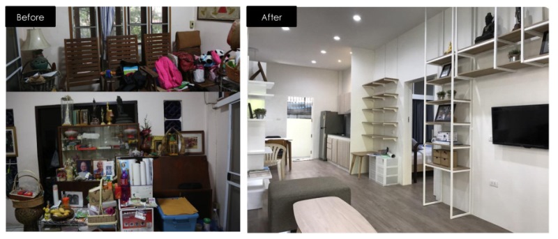 ทางทีมงานปรับห้องรับแขกให้เป็นโซนพักผ่อน โดยนำโซฟาเข้ามาใช้งานแทนเก้าอี้ไม้ เพิ่มโต๊ะวางของพร้อมทั้งเพิ่มฟังก์ชั่นให้เป็นโซนเรียนรู้ของเด็กๆ ด้วยการติดสมาร์ททีวีที่สามารถเชื่อมต่ออินเตอร์เน็ตได้ไว้บนผนังห้อง ส่วนด้านบนของผนังทำเป็นชั้นวางของหลายช่องลดหลั่นกัน ด้านบนสุดสามารถวางพระพุทธรูปและสิ่งศักดิ์สิทธิ์ได้อย่างงดงาม เพื่อให้เหมาะกับการใช้งานของสมาชิกในครอบครัวทั้งสองวัยไปพร้อมกัน