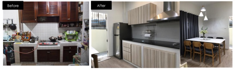 พื้นที่ส่วนต่อมา คือ ห้องรับประทานอาหาร ยังคงจัดให้อยู่มุมเดิมในบ้าน และได้ก่ออิฐสร้างเคาน์เตอร์อย่างแข็งแรงขึ้นใหม่เป็นครัวเล็ก ๆ ติดตั้งเตาไฟฟ้า เครื่องดูดควัน และตู้จัดเก็บอุปกรณ์ได้อย่างเป็นระเบียบ สามารถจัดเตรียมอาหารได้อย่างสะดวกยิ่งขึ้น รวมทั้งย้ายประตูทางออกด้านหลังบ้านมาไว้ในโซนนี้ เพื่อให้สะดวกในการออกสู่ส่วนล้างจานและซักผ้า