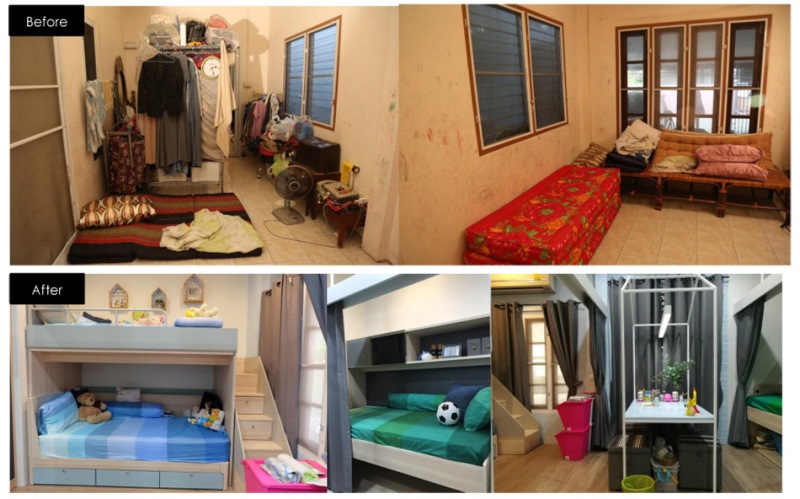 ทีมงานเลือกใช้เตียงสองชั้นเพื่อประหยัดพื้นที่สำหรับฝาแฝดฮุ้ยยี่และฮุ้ยซางอยู่ฟากหนึ่งของห้อง ผนังฝั่งตรงข้ามเป็นเตียงของพี่พอหนุ่มน้อย โดยมีพื้นที่เก็บของส่วนตัวได้เยอะพอสมควร เตียงทั้ง 2 ฝั่งมีม่านที่สามารถเลื่อนปิดได้เมื่อต้องการความเป็นส่วนตัว ส่วนพื้นที่ระหว่างกลางของเตียงทั้ง 2 ฝั่งได้ดีไซน์เป็นบริเวณอ่านหนังสือของเด็ก ๆ ด้วยการวางโต๊ะและเก้าอี้เพื่ออ่านหนังสือทำการบ้านสำหรับทุกคน และยังทำหน้าที่กั้นบริเวณที่นอนของเด็กชายและเด็กหญิงออกจากกันเป็นสัดส่วนยิ่งขึ้น