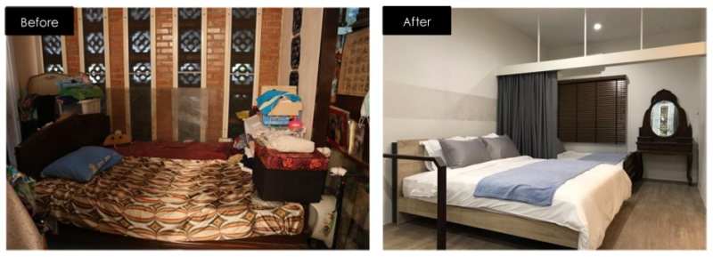 ในขณะที่อีกฟากของห้องนั้น โซนด้านในก็จะเป็นส่วนที่นอนของผู้ใหญ่ทั้ง 3 คน โดยจัดพื้นที่ด้านในสุดให้กับคุณทวด ยังใช้เตียงไม้เดิมที่ผูกพันโดยเปลี่ยนที่นอนให้สบายยิ่งขึ้น รวมทั้งวางโต๊ะเครื่องแป้งโบราณแสนรักไว้ด้านท้ายเตียง โดยติดตั้งม่านกั้นเพื่อความเป็นส่วนตัวในการพักผ่อนช่วงกลางวัน