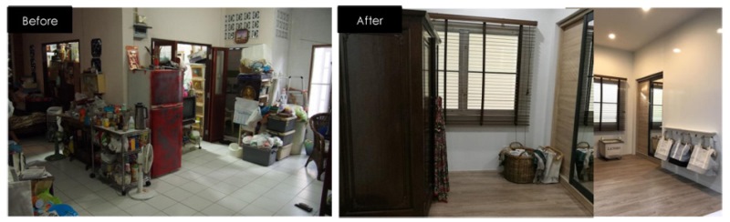 ปัญหาของบ้านหลังนี้ เริ่มตั้งแต่ไม่มีการแบ่งพื้นที่ใช้สอยเป็นสัดส่วน แสงสว่างไม่เพียงพอแถมอากาศก็ยังไม่ถ่ายเท พื้นที่ส่วนแรก คือ พื้นที่ส่วนกลาง เป็นบริเวณที่เปิดประตูด้านหน้าเข้ามาในตัวบ้าน เป็นพื้นที่โล่งมีเก้าอี้ไม้ตัวสูงใช้วางของแทนการนั่ง เป็นพื้นที่ที่สว่างที่สุดในบ้าน เด็ก ๆ ใช้พื้นที่ทำการบ้านด้วยการนอนเขียนหนังสือบนพื้น