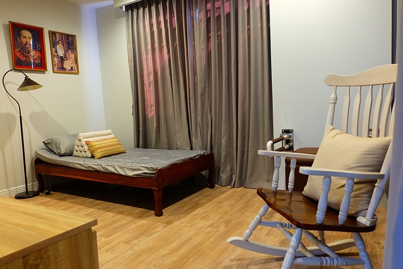 นอกจากนี้ได้กั้นพื้นที่ใต้บันไดให้เป็นตู้เก็บของอเนกประสงค์ สำหรับห้องใหม่ด้านหน้าเปิดเชื่อมกับห้องรับแขก มีเตียงไว้สำหรับคุณพ่อใช้พักผ่อนดูทีวี หรือสามารถใช้เป็นห้องนอนคุณแม่ในอนาคต โดยทำมุมนั่งพิเศษเพื่อให้คุณพ่อพยุงตัวเองเมื่อเปลี่ยนเสื้อผ้าหรือผ้าอ้อมได้สะดวกยิ่งขึ้น รวมทั้งทำโต๊ะล้อเลื่อนใช้เก็บของส่วนตัวของคุณพ่อที่สามารถเลื่อนไปยังทุกที่ได้ ช่วยให้สะดวกไม่ต้องเรียกคนอื่นยามต้องการของที่ใช้ประจำ