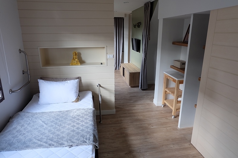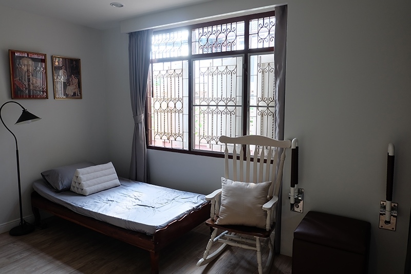 ทีมงานจึงทุบกำแพงเปิดพื้นที่เชื่อมต่อกับห้องเก็บของที่ไม่ได้ใช้ประโยชน์ด้านหน้าให้โล่ง เพื่อให้อากาศถ่ายเทได้ดียิ่งขึ้น และสร้างผนังหัวเตียงให้กับคุณพ่อเพื่อคงความเป็นส่วนตัว ติดราวจับบนกำแพงช่วยให้ลุกและเคลื่อนตัวได้สะดวก