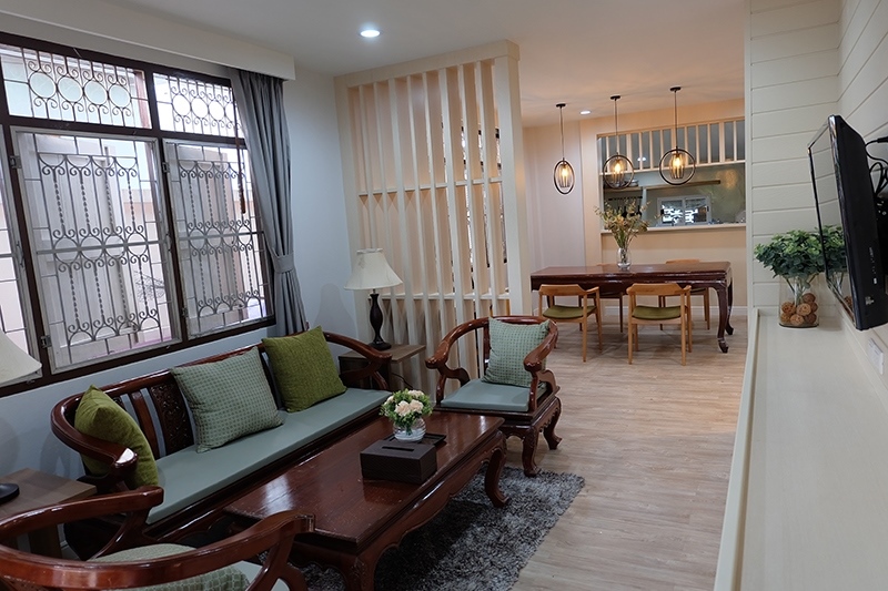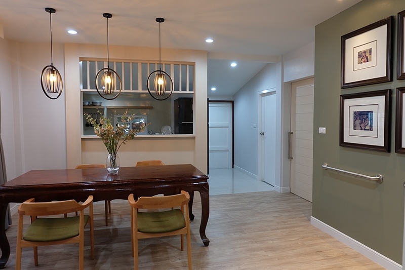 พื้นที่ถัดจากห้องรับแขก คือ ห้องรับประทานอาหารและห้องครัว ทีมงานยังคงใช้โต๊ะอาหารตัวเดิม เนื่องจากคุณพ่อรักเฟอร์นิเจอร์เก่ามาก เลือกใช้เก้าอี้ที่สูงพอเหมาะ ติดโคมไฟเพิ่มความสว่างแก่โต๊ะอาหาร และเปิดพื้นที่โล่งให้วีลแชร์สามารถเคลื่อนที่ผ่านได้สบาย รวมทั้งคุณพ่อสามารถนั่งวีลแชร์ที่หัวโต๊ะร่วมรับประทานอาหารอย่างอบอุ่นได้ทั้งครอบครัว