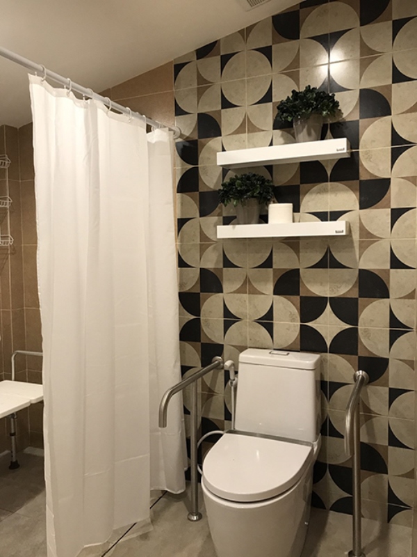 ภายในห้องน้ำเลือกใช้สุขภัณฑ์ที่เหมาะกับผู้ใช้งานบนวิลแชร์ และติดตั้งในระดับความสูงที่รองรับวิลแชร์ อาทิ เก้าอี้นั่งอาบน้ำที่เปิดข้างหนึ่ง ติดตั้งราวจับเพิ่มความปลอดภัย รวมทั้งระบบเตือนภัยฉุกเฉินไว้ในกรณีที่ผู้สูงอายุเกิดอุบัติเหตุคนในบ้านจะได้เข้าช่วยได้ในทันที