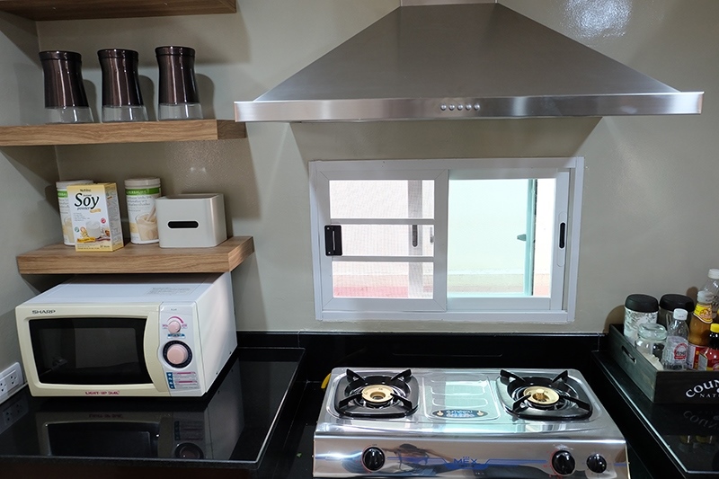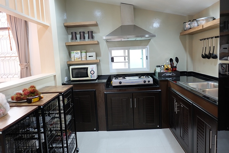 ส่วนห้องครัวนั้น แต่เดิมมีผนังกั้น แม้มีหน้าต่างอยู่หลายบานก็ปิดไว้เนื่องจากปัญหาเรื่องฝุ่น ทางทีม Home Service ปรับปรุงโดยทุบผนังกั้นห้องครัวและตัวบ้านออกให้เปิดโล่ง ช่วยให้อากาศในบ้านถ่ายเทดีขึ้น รวมทั้งปรับขนาดหน้าต่างให้เล็กลงและเปลี่ยนเป็นบานเลื่อนเพื่อแก้ไขปัญหาฝุ่นละออง และติดตั้งอุปกรณ์ระบายอากาศเพื่อช่วยแก้ปัญหา โดยทำเคาเตอร์กั้นระหว่างครัวและห้องอาหารให้เป็นสัดส่วน สามารถทำอาหารและยกเสิร์ฟที่โต๊ะอาหารได้อย่างสะดวก