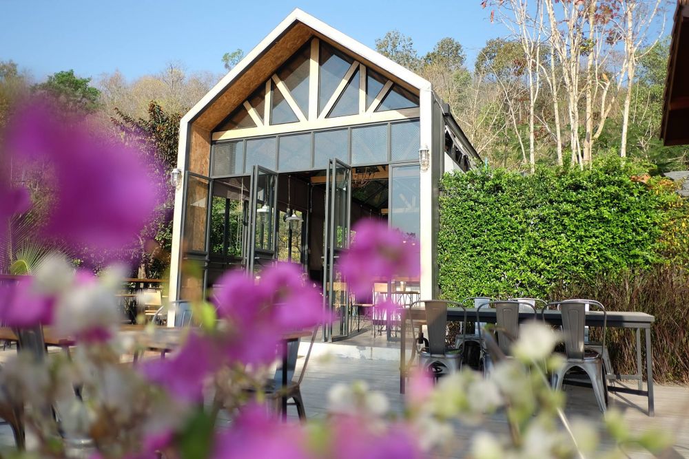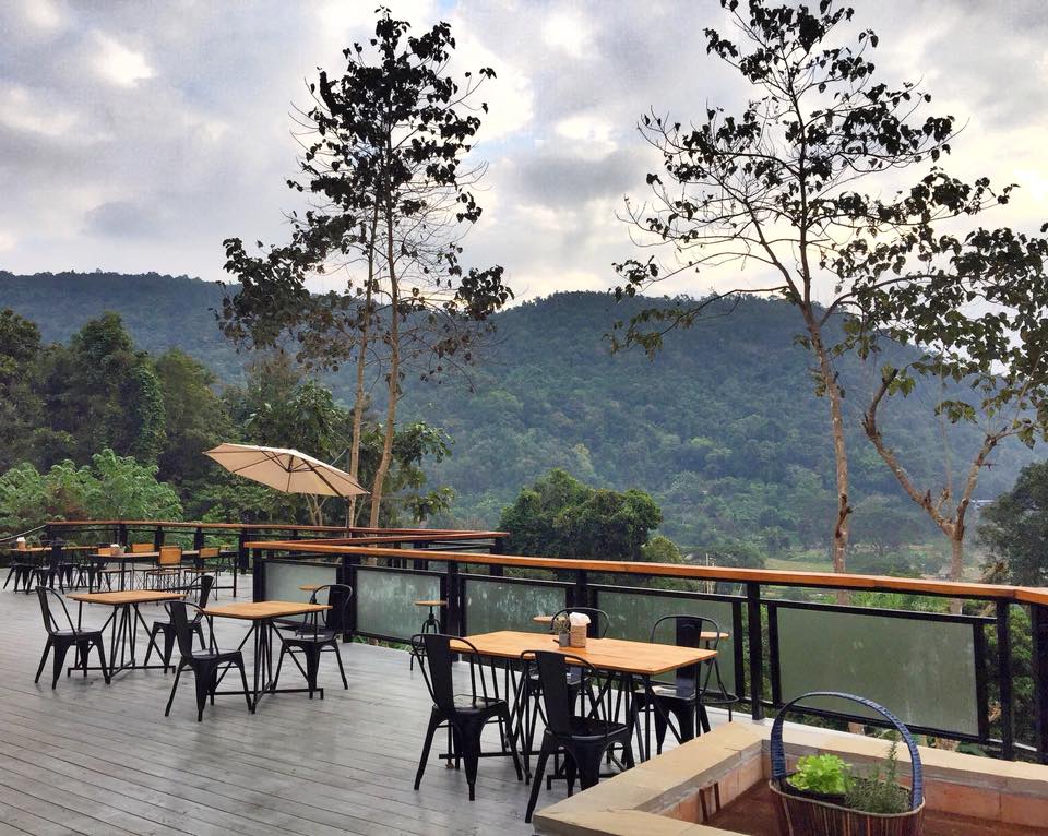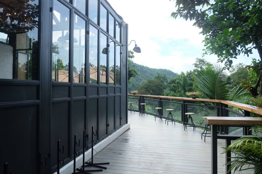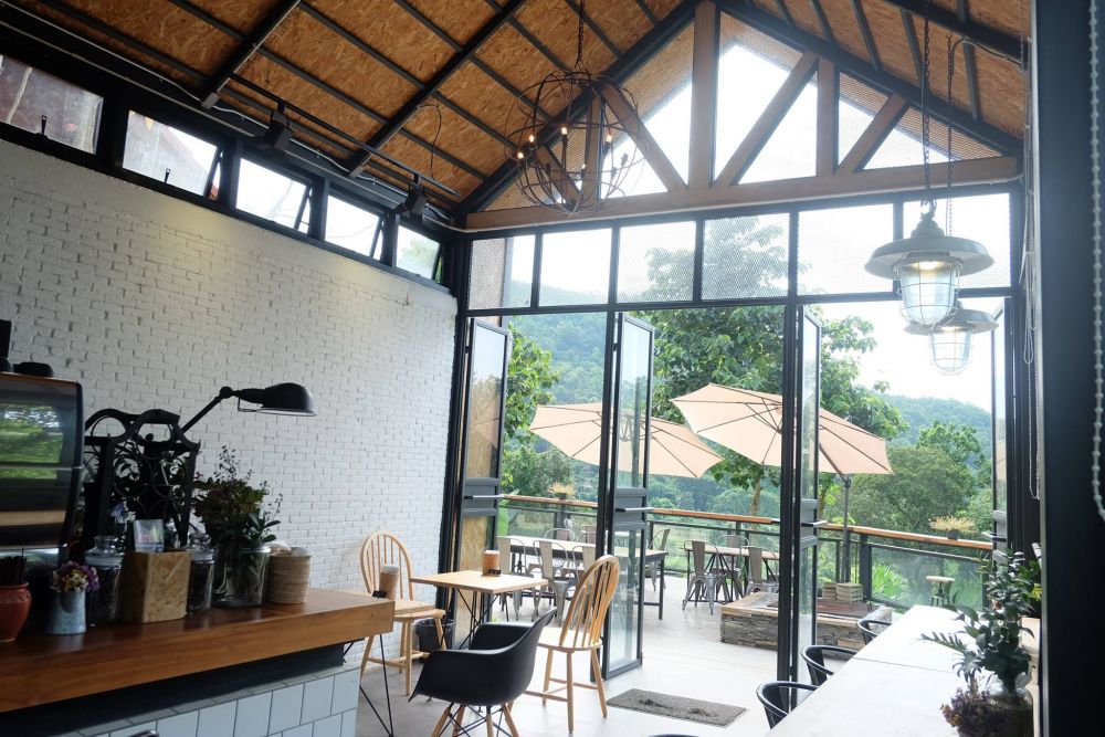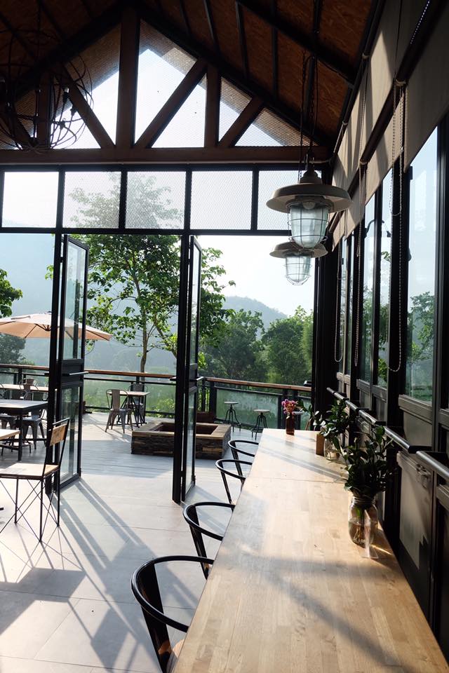 ท่าช้างฮิลล์ คาเฟ่สไตล์ Industrial Loft ตัวร้านเป็นกระจกใสออกแบบให้เหมือนโรงนาสมัยก่อน บรรยากาศชิลล์ๆ เท่ๆ ปักหลักท่ามกลางขุนเขามีมุมระเบียงไม้ด้านนอกให้นั่งจิบกาแฟมองวิวสวยเพลินๆ