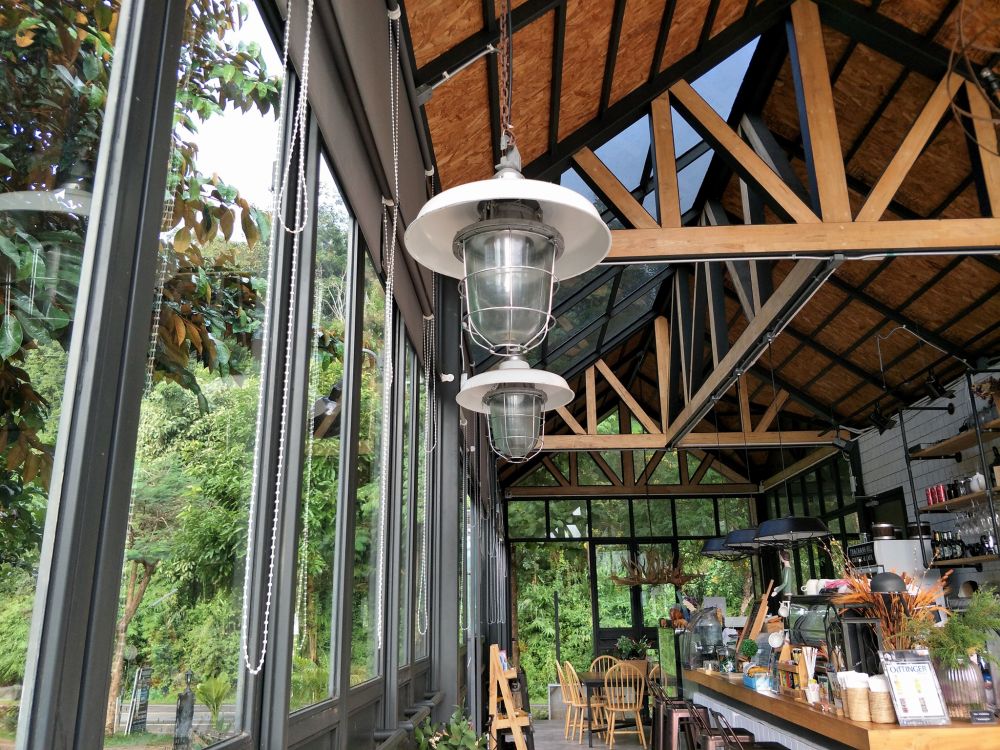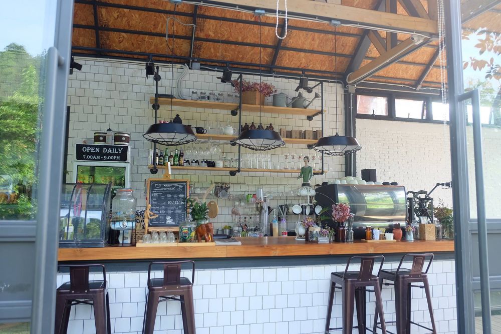 ตัวร้านโปร่งโล่ง มีทั้งโซนห้องหน้าบาร์ และโซนห้องแอร์ หรือจะออกมานั่งที่ระเบียงยาว ชมวิวป่าเขาก็ได้ ทางร้านมีเมนูกาแฟต่างๆ ให้เลือกสั่งมานั่งจิบเพลินๆ และอาหารคาวหวาน เครื่องดื่มอื่นๆ อีกมากมาย