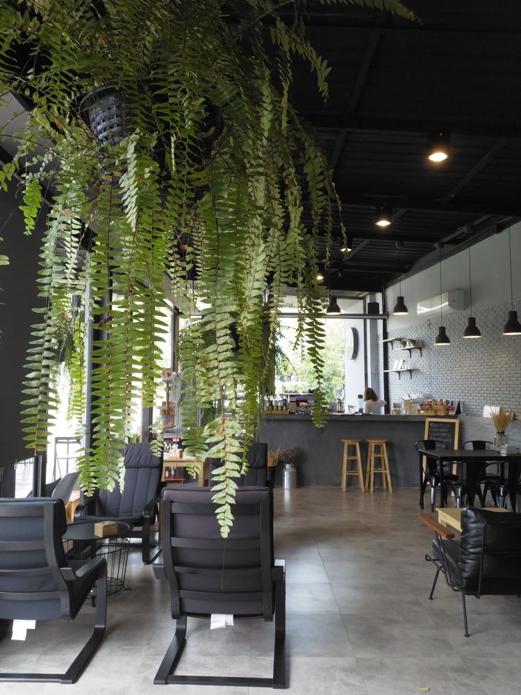 ภายในร้านตกแต่งให้มีกลิ่นอายความเป็นลอฟท์เบาๆ ด้วยผนังอิฐปูนเปลือย มีต้นเฟิร์นแขวนประดับรอบๆร้าน และจะมี 2 โซนให้เลือกนั่ง คือโซนห้องแอร์ นั่งรับแอร์เย็นฉ่ำๆ สามารถเดินมาสั่งเครื่องดื่มที่คอฟฟี่บาร์หน้าร้านแล้วรอรับได้เลย หรือรอให้พนักงานมาเสิร์ฟก็ได้