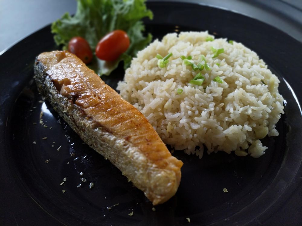 เมนูอาหารที่ร้านแนะนำก็คือ ข้าวหมููย่าง ข้าวผัดกระเทียมแซลมอน