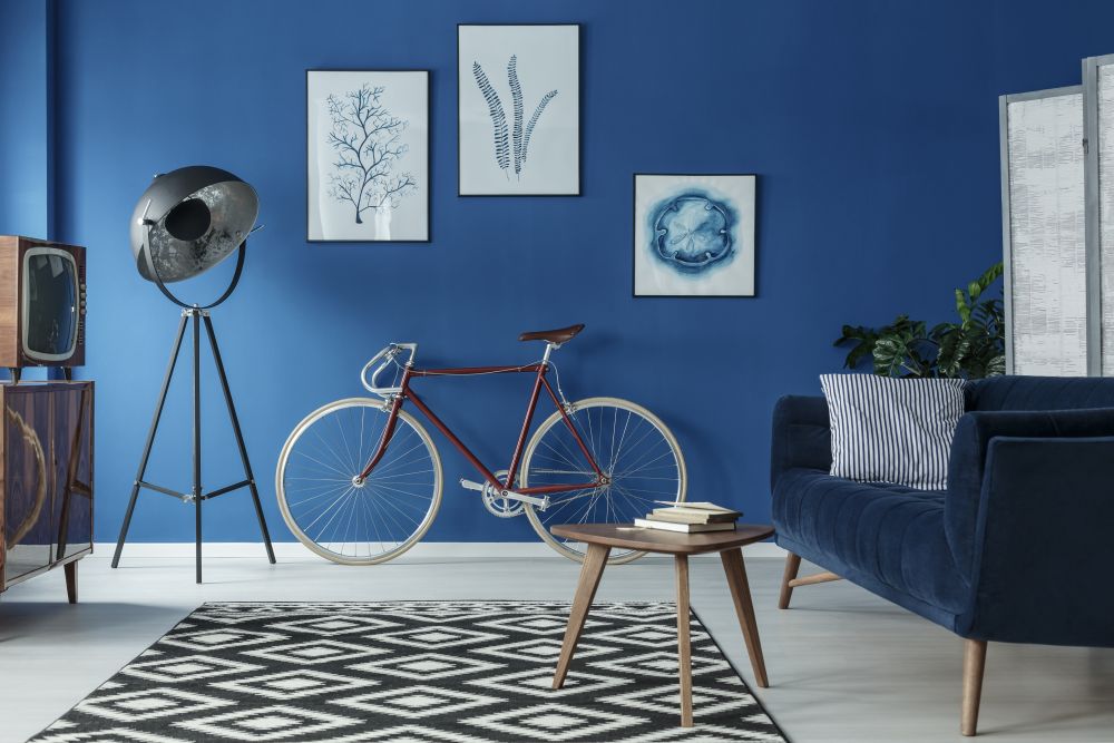 เพิ่มเสน่ห์ให้กับห้องด้วยการเลือกทาสีห้องเป็นโทนสีน้ำเงิน บวกกับโซฟาสี Navy ที่มองดูแล้วแมทช์กันได้เป็นอย่างดี เพิ่มรายละเอียดคูลๆ ด้วยการติดกรอบภาพอาร์ทๆ ในโทนสีน้ำเงินเช่นกัน ไม่หมดแค่นั้นยังสอดแทรกความวินเทจเข้าไปอีกนิดด้วยเฟอร์นิเจอร์ลายไม้ สะท้อนคาแรคเตอร์เท่ๆ สำหรับใครที่ชอบการตกแต่งในแบบมินิมอลอยู่แล้วบอกเลยว่าเข้าทางมากๆ "สีน้ำเงิน" ช่วยเพิ่มลูกเล่นได้อีกเพียบ