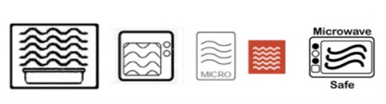 จากชนิดของภาชนะที่ได้แนะนำไปข้างต้นว่ามีภาชนะที่เข้าไมโครเวฟได้และไม่ได้แบบไหนบ้าง เราสามารถสังเกตได้จากสัญลักษณ์เข้าไมโครเวฟตามรูปภาพด้านล่างนี้