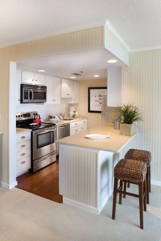 จัดเคาน์เตอร์ครัวให้อยู่บริเวณมุมใดมุมหนึ่งของบ้าน และแบ่งโซนระหว่างห้องครัวและพื้นที่อื่นๆ ให้ชัดเจน ซึ่งหากใครมีเครื่องครัวเยอะก็สามารถใช้ตู้เก็บเครื่องครัวติดที่ผนังเหนือเคาน์เตอร์ครัวก็เป็นอีกหนึ่งวิธีช่วยประหยัดพื้นที่ห้องครัว อีกทั้งยังสามารถใช้เป็นที่เก็บข้าวของเครื่องใช้ได้อีกมากเลยทีเดียว