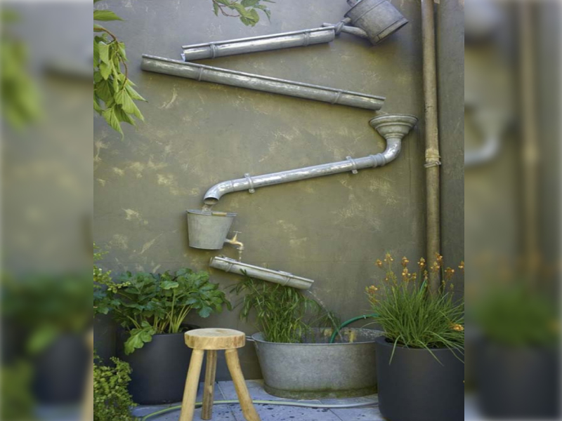 สำหรับรางน้ำฝนแบบนี้จะเหมาะกับการแต่งบานสไตล์ลอฟท์นะครับ เพราะจะเน้นสีปูนและโลหะ โดยผนังด้านหลังจะเป็นปูนเปลือยอยู่แล้ว สิ่งที่เราต้องทำก็เพียงแค่หาบัวรดน้ำหรือถังน้ำที่ไม่ได้ใช้ และรางน้ำฝนหรือท่อสัก 2-3 ท่อน นำมาเรียงกันในแบบที่ชอบ ให้น้ำฝนไหลลงมาข้างล่างได้ อยู่ที่เพื่อนๆ ดีไซน์เลยครับ เมื่อเสร็จแล้วมันก็จะเป็นรางน้ำฝนเท่ๆ แนวๆ แบบในภาพเลยครับ