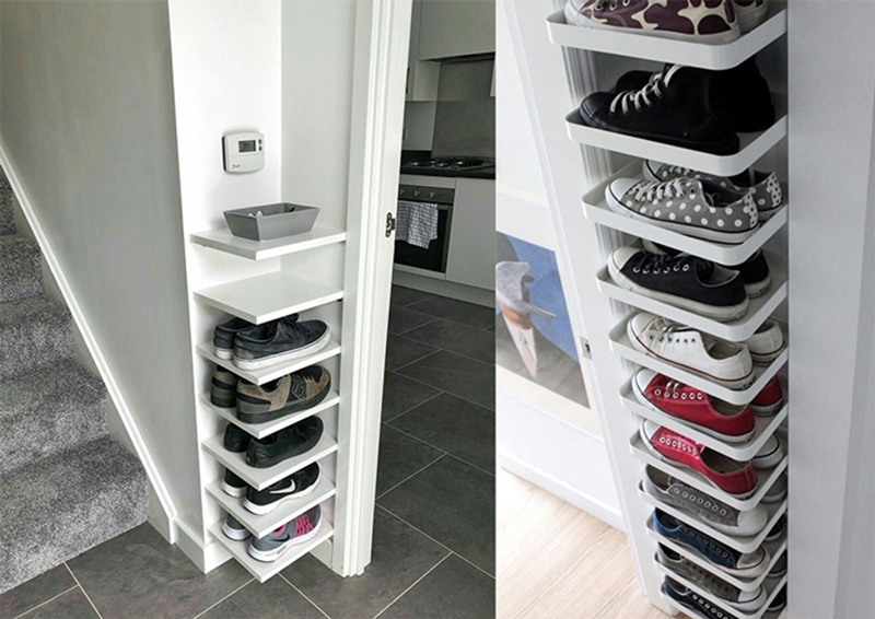 มุมห้องหรือบริเวณเสาบ้านนี่เป็นพื้นที่เจ้าปัญหาอยู่แล้วครับ เพราะตามซอกมุมเหล่านี้มักหาของเข้าไปวางให้พอดีไม่ค่อยได้ จะเหลือเป็นพื้นที่สี่เหลี่ยมให้เห็นอยู่เป็นประจำ ซึ่งถ้ามองดีๆ มุมเล็กๆ ที่ไม่มีใครเหลียวแลนี้ เราสามารถนำแผ่นไม้ แผ่นพลาสติก หรือแผ่นเหล็กขนาดพอดีมุมมาใส่เป็นชั้นๆ ให้กลายเป็นชั้นวางรองเท้าสุดแนวของเราได้ ทั้งประหยัดพื้นที่ ทั้งสวย และไอเดียดีเลยใช่มั้ยล่ะครับ