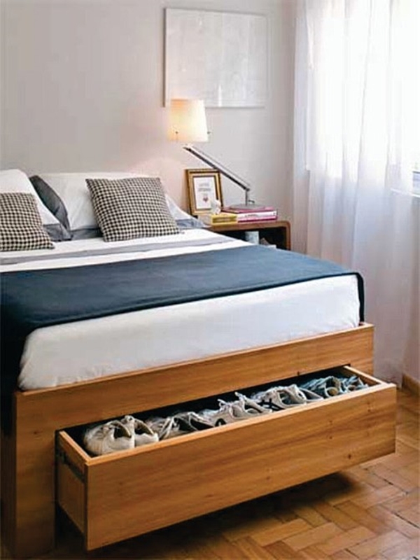 เฟอร์นิเจอร์สมัยนี้ไม่ได้เน้นสวยอย่างเดียวเหมือนเมื่อก่อนแล้วครับ ต้องทั้งสวยทั้งฟังก์ชั่นครบด้วย อย่างเตียงนอนก็มักจะมีลิ้นชักเก็บของด้านล่างติดมาให้ด้วย สบายเราเลยทีนี้ เราก็นำลิ้นชักใต้เตียงมาเป็นที่เก็บรองเท้าซะเลย เรียกได้ว่าวันไหนรีบๆ นี่แต่งตัวใส่รองเท้าจากข้างเตียงได้เลย สะดวกสุดๆ
