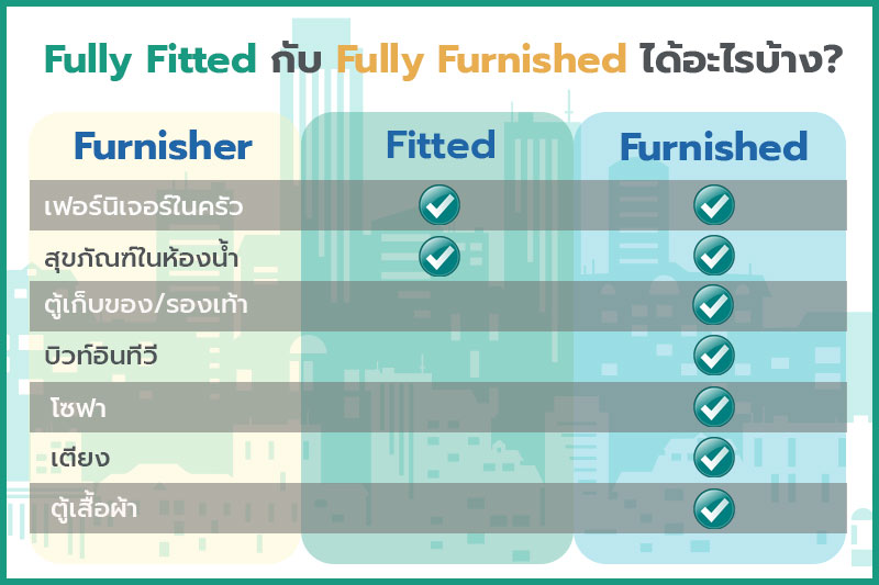 สิ่งที่ดลใจให้ผู้ที่อยากอยู่คอนโด เกิดความต้องการอยากซื้อโครงการนั้นๆ ไม่ใช่แค่เรื่องของราคาอย่างเดียว แต่เป็นของที่จะได้กลับมาด้วย เพราะทุกครั้งเราจะต้องถามเซลล์เสมอว่า หนึ่งห้องนี้ได้อะไรบ้าง หรือขายแบบไหน และประโยคที่ได้กลับมาจะเป็น ขายแบบ Fully Fitted ไม่ก็ Fully Furnished โดยสองคำนี้ มีข้อแตกต่างกันอยู่นิดหน่อย