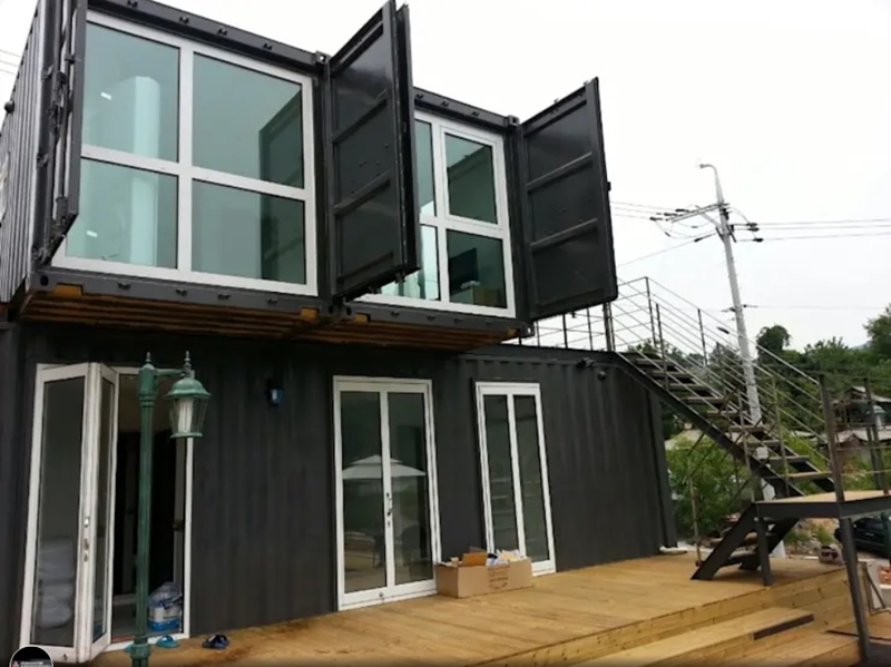 สีดำนี่ทำอะไรก็ดูดีไปหมดจริง ๆ (ไม่ลำเอียงเลย) ดูอย่างบ้านตู้คอนเทนเนอร์สองชั้นนี้สิครับ เป็นการใช้ตู้สองขนาดไม่เท่ากันมาวางซ้อนกัน พื้นที่ที่เหลือด้านบนก็ทำเป็นระเบียงรับลม ส่วนด้านยาวของตู้ก็ทำเป็นหน้าต่างบานใหญ่ ให้ชมวิวได้อย่างเต็มที่และทำให้ด้านในดูกว้างขึ้น ประกอบกับระเบียงไม้ด้านล่างแล้ว ต้องบอกเลยว่าทั้งสวย ทั้งแปลก ทั้งเท่ ไม่เหมือนใครดีจริง ๆ ครับ