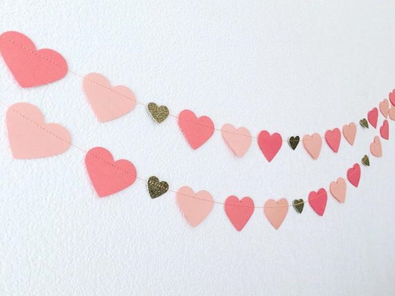 Paper Garland คือของแต่งบ้านที่เป็นสายยาว ๆ ไว้ผูกบนเพดานน่ะครับ ที่เห็นบ่อย ๆ ก็จะเป็นแบบที่เป็นธงสามเหลี่ยม แต่คราวนี้เราประยุกต์เป็นหัวใจแทน ก็จะเพิ่มความน่ารัก สดใส ขี้เล่นได้อีกครับ ยิ่งคอมโบกับลูกโป่ง หมอน ดอกกุหลาบ บอกเลยว่าแฟนรัก แฟนหลง จนโงหัวไม่ขึ้นแน่นอน