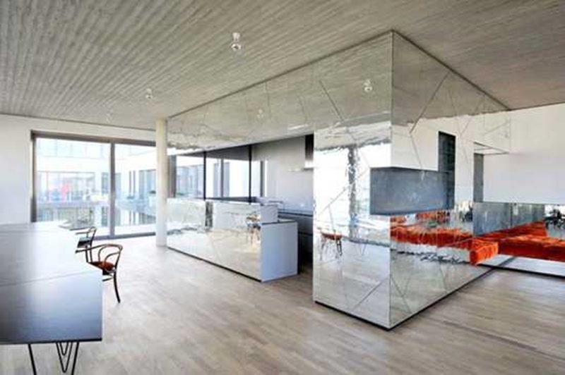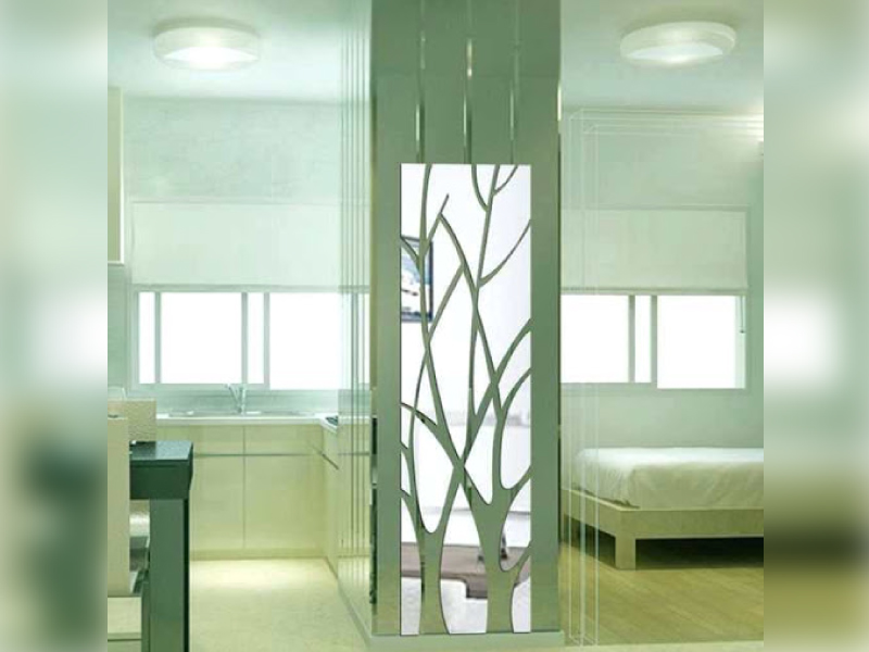 ไอเดียนี้ถือเป็นอีกมิติหนึ่งของการใช้กระจกเงาเลยครับ เพราะนอกจากใช้ช่วยหลอกตาเพิ่มพื้นที่บนตำแหน่งเสาแล้ว เรายังสามารถเพิ่มลวดลายลงบนกระจกเงาได้ด้วยครับ อย่างในรูปนี้ก็จะเพิ่มเป็นรูปต้นไม้ลงไป จึงทำให้เกิดลวดลายที่แปลกตา แต่ยังไม่เสียความเป็นกระจกเงาไป กลับเพิ่มความสวยงามขึ้นมาอีกต่างหาก เจ๋งจริง ๆ ครับไอเดียนี้
