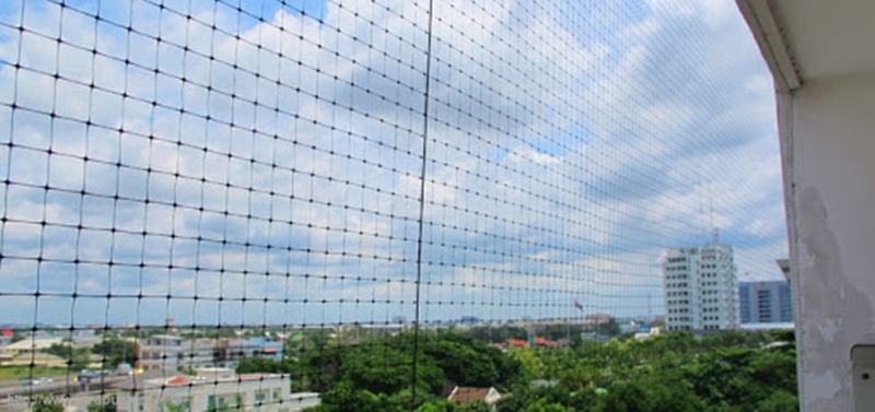การขึงตาข่ายกันนกนั้นเป็นเหมือนดาบสองคมครับ ข้อดีชัดเจน ข้อเสียก็ชัดเจนเหมือนกัน ข้อดีของการขึงตาข่ายกันเจ้าพิราบตัวแสบคือ มันเข้ามาไม่ได้แน่ ๆ ถ้าตาข่ายไม่ชำรุด เกิดตาข่ายขาดเป็นรูให้นกลอดเข้ามาได้เมื่อไหร่ก็บันเทิงแน่นอน ส่วนข้อเสียอย่างใหญ่หลวงที่ทำให้ผมไม่ค่อยแนะนำวิธีนี้สักเท่าไหร่ ก็คือมันจะทำให้วิวระเบียงของคุณเละทันทีครับ ไม่มีความสวยงาม เหมือนตัวเองอยู่ในกรงแทน ... ก็ลองตัดสินใจกันดูนะครับ