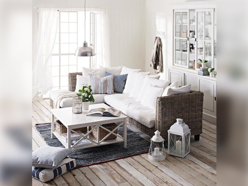 พอพูดถึงเฟอร์นิเจอร์หวายแล้ว ส่วนใหญ่จะนึกถึงเก้าอี้หรือเปลสีน้ำตาลใช่มั้ยล่ะครับ แต่จริง ๆ แล้วเฟอร์ฯ หวายสีเข้มก็มีเหมือนกันนะ แถมยังเท่ไม่เหมือนใครอีกด้วย ยิ่งแต่งคู่กับสีอ่อนอย่างสีครีมหรือสีขาวยิ่งเข้ากันครับ อย่างไอเดียนี้จะเป็นการใช้โซฟาหวายสีเข้ม ตัดกับเบาะ หมอน ผนัง ผ้าม่าน ทุกอย่างสีขาวหมดเลย จึงทำให้โซฟาที่ทำจากหวายสานนั้นดูเด่นและสวยขึ้นมากเลยครับ เรียกว่าชูวัตถุดิบได้สุดยอดไปเลย