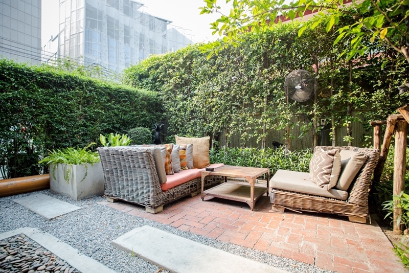 อันนี้ต้องบอกว่ามาเป็นเซ็ต ยกมาตั้งกันแบบ Out door กันเลย เป็นเซ็ตโซฟาหวายพร้อมโต๊ะกลาง ตั้งในสวนหน้าบ้าน ซึ่งพอความเป็นหวายมารวมกับความเขียวของธรรมชาติแล้วเนี่ย มันเข้ากันมากนะครับ ด้วยเนื้อสัมผัสของเฟอร์หวายที่จะยวบนิด ๆ มันเข้ากับความพริ้วไหวของใบไม้ในสวนมาก ยิ่งลมโชยๆ ตอนเย็นนะ นั่งแล้วหายเหนื่อยเลยแบบนี้