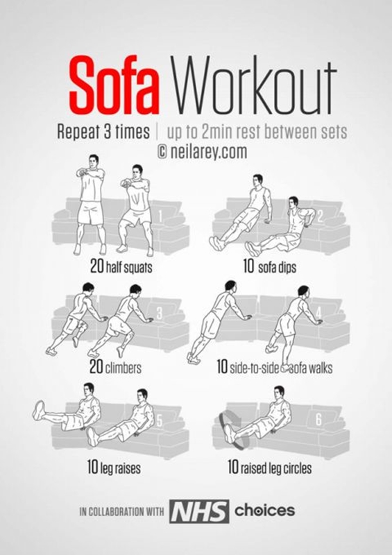 โซฟานอกจากจะใช้นั่งและนอนดูทีวีเพลิน ๆ แล้ว ยังถือเป็นอุปกรณ์ออกกำลังกายอย่างดีอีกชิ้นหนึ่งครับ เพราะว่าเราสามารถออกกำลังกายโดยใช้โซฟาเป็นตัวช่วยได้ ไม่ว่าจะเป็นการนั่งบนโซฟาและเตะขาสลับซ้ายขวา หรือจะวิดพื้นแบบแอดวานซ์โดยใช้ขาพาดบนโซฟาและใช้มือดันพื้นก็ท้าทายดีนะ เห็นไหมครับว่าแค่ของสามัญอย่างโซฟายังมีประโยชน์ที่เราคาดไม่ถึงเยอะแยะไปหมด