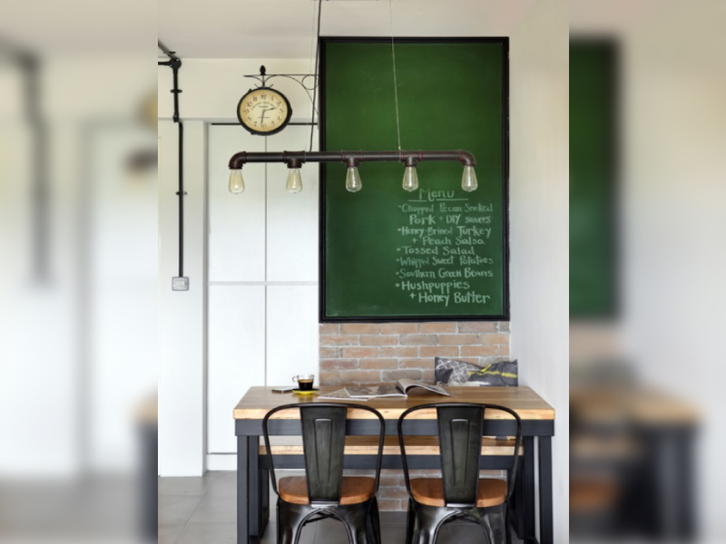 อย่างที่บอกครับว่า วอลเปเปอร์นั้นสามารถช่วยให้อารมณ์ของมุมนั้น ๆ เปลี่ยนไปได้อย่างดีเลย อย่างไอเดียนี้เป็นการเลือกใช้มุมเล็ก ๆ ที่ไม่ค่อยได้ใช้งาน มาเปลี่ยนเป็นมุมคาเฟ่นั่งอ่านหนังสือชิล ๆ เริ่มจากวอลเปเปอร์อิฐแดง เพิ่มความ Loft ด้วยนาฬิกากับ Lighting สไตล์ Industrial และการใช้ท่อเหล็กร้อยสายไฟก็ยิ่งทำให้อารมณ์ Loft ชัดขึ้นอีก ใช้พื้นที่น้อยด้วยนะครับ น่าสนใจมาก