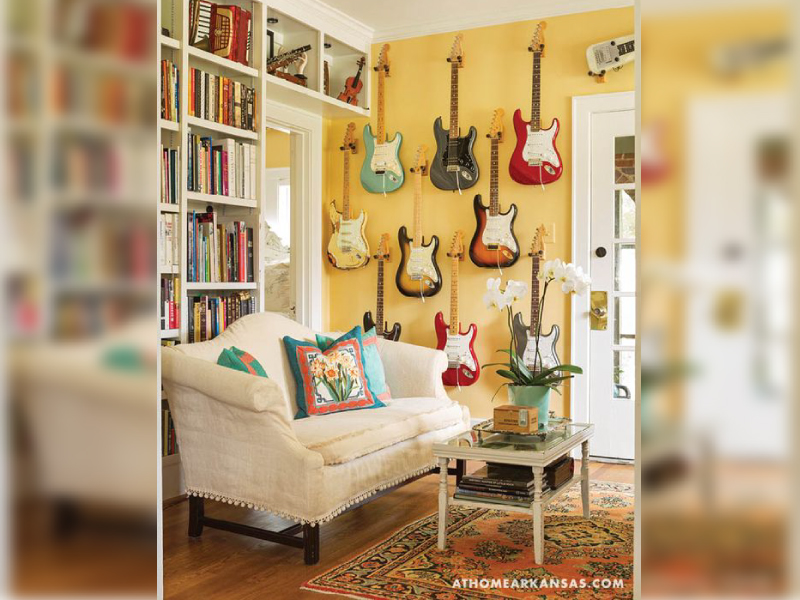 อันนี้เป็นไอเดียสำหรับสายสะสมครับ ใครที่สะสมกีตาร์ไว้เยอะจนวางไว้ให้ฝุ่นเกาะเล่นแล้วเนี่ยผมว่าน่าเสียดายออกนะ ในเมื่อมีของดีเราก็ต้องเอาออกมาโชหน่อยเส้ ไอเดียนี้จะเป็นการใช้กีตาร์ในคอลเลคชั่นส่วนตัวมาประดับบนผนังเปรียบเสมือนไอเทมตกแต่งบ้านสวย ๆ เซ็ตนึงเลยครับ แขวนทื่อ ๆ แบบนี้แหละ แต่ด้วยรูปลักษณ์และสีสันที่ต่างกันก็ทำให้ผนังด้านนี้มีสีสันขึ้นเยอะเลยล่ะครับ