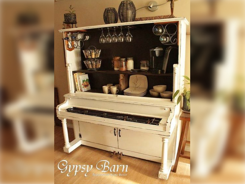 เปียโนเป็นเครื่องดนตรีที่ผมว่าทั้งสวย มีเสน่ห์ สง่างามสุด ๆ ด้วยรูปทรงแบบนั้นจะเอาไปทำเป็นอะไรก็ได้อะ ดูดีทุกมุมมองจริง ๆ ไอเดียนี้เค้าเลยนำโครงของเปียโนมาทำเป็นบาร์เล็ก ๆ ซะเลย โดยต่อตู้ด้านบนขึ้นมาให้มีที่เก็บของหน่อย เท่านี้ก็ฟังก์ชั่นครบแล้วครับ มีทั้งที่เก็บของ บาร์วางแก้ว ช่องเก็บของด้านล่าง ที่แขวนโคมไฟด้านบน ยิ่งสีเก่า ๆ ลอก ๆ แบบในรูปนะ ยิ่งคลาสสิคมากเลยครับ