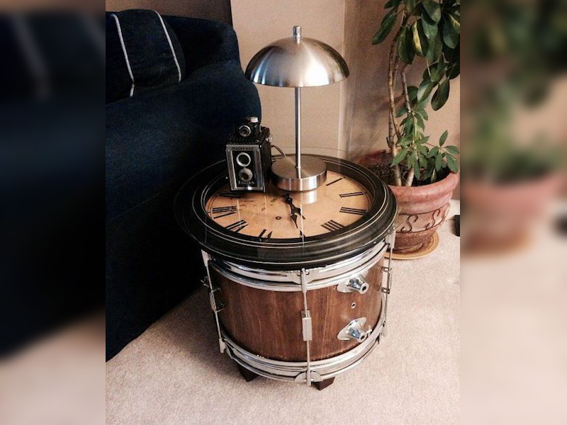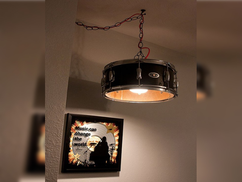 เอาใจคนรักกลองกันบ้าง ด้วยรูปทรงของกลองที่เป็นทรงกลมจึงทำให้เหมาะกับการเอาไปทำเป็นพวกโต๊ะ เก้าอี้ หรือโคมไฟมากครับ อย่างไอเดียนี้จะเป็นการนำกลองมาใส่หลอดไฟทำเป็นโคมไฟสไตล์ลอฟท์เท่ ๆ ไปเลย ถ้าจะให้เข้าธีมก็ใช้โซ่ร้อยด้านบนและห้อยลงนิดหน่อย ส่วนสายไฟก็ร้อยไว้กับสายโซ่ โดยรวมแล้วออกมาสวยมากเลยครับ ถูกใจสายมือกลองแน่นอน