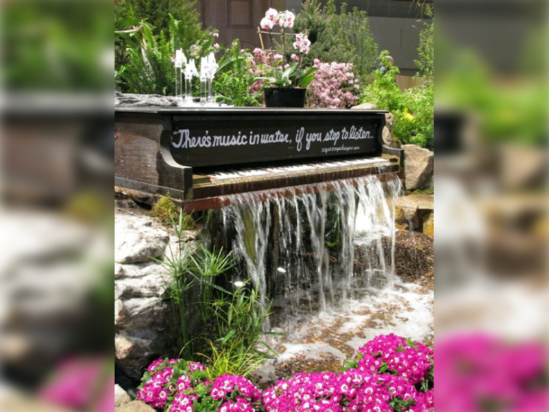 ไม่ใช่แค่ในบ้านนะครับที่สามารถนำเครื่องดนตรีไปตกแต่งได้ นอกบ้านก็ได้ด้วย ! แค่นอกบ้านยังไม่พอ ในน้ำไปเลย ! ไอเดียนี้จะเป็นการนำเปียโนหลังเก่าไปตั้งไว้เป็นทางไหลของน้ำตกลงมาสู่บ่อน้ำด้านล่าง ผมว่ามันเข้ากันมากเลยนะ ยิ่งมีการนำต้นไม้และก้อนหินมาประดับรอบ ๆ เปียนโนแล้วยิ่งเนียนและสวยงามมากเลยครับ